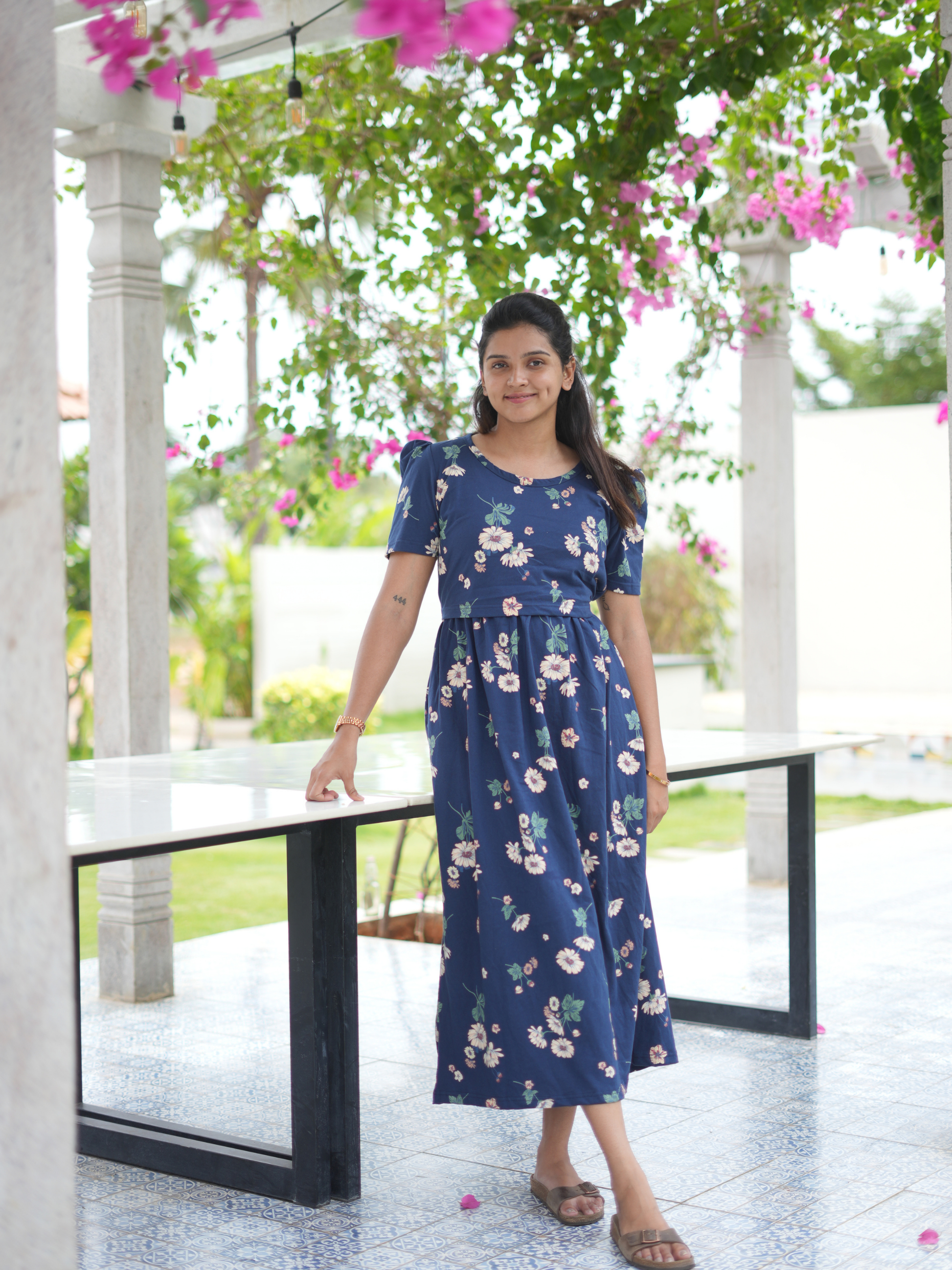 Blue Floral | Zipless Maternity Maxi | Full Length | Puff Sleeve